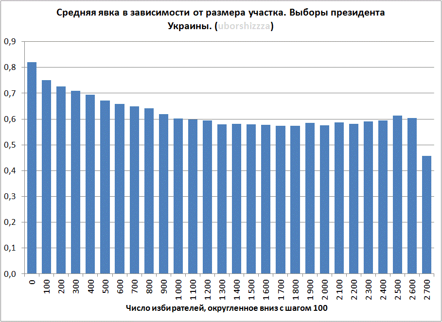 На следующем графике – средняя явка в зависимости от числа избирателей на участке (число округлено вниз с шагом 100). Опять классика – очень маленькие спецучастки с практически 100-ной явкой